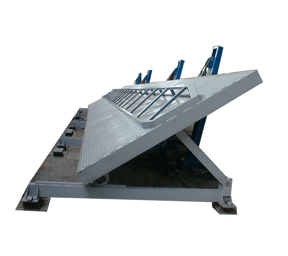 The car unloader is designed for unloading of grain crops, grain and other loose materials through the open lateral side of the single-vehicle autotrace with trailers and trucks with tilt angle of 38 degrees.